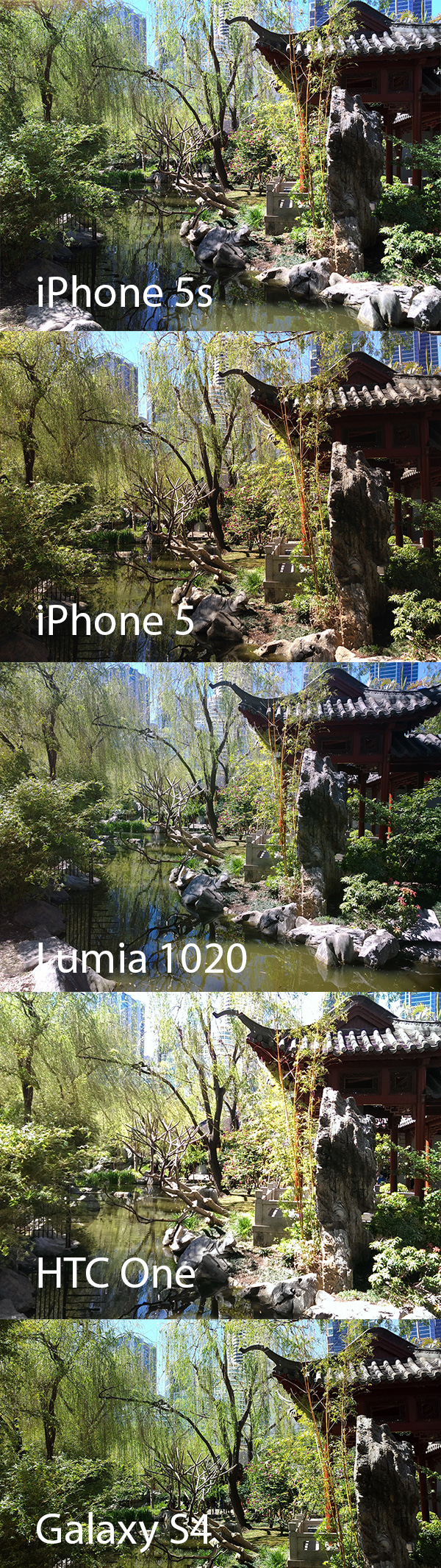 One of the trickiest scenes to capture because of the high level of foreground and background detail, the cameras have their work cut out for them in this final shot. The HTC One, again, blows out the highlights in the sky and the foreground so much that this detail is not recoverable. The Galaxy S4 has a nice, crisp image, though it is a bit too green, just like the iPhone 5s image. The iPhone 5 photo looks pleasing, but the winner for this one is the 1020, which has an even exposure and a good amount of detail.
