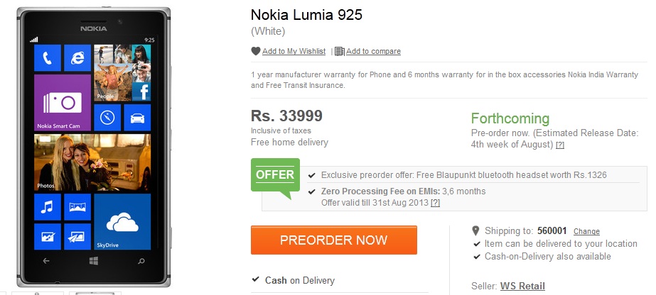 Lumia 925 has now gone on pre-order in India. Major retailer Flipkart like all times is the first one to place it on pre-order. It is priced 33999 INR (560 USD) which is really less than what we expected but in line with Nokia’s pricing of Lumia 925 in China, where it went for a price equal to Lumia 920’s current price. Expected delivery is mentioned as 4th week of August, hence expect official Nokia shop and retail stores to get the stock sooner than 4th week of August.