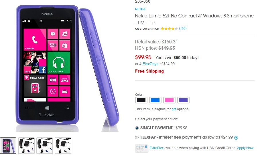 It is certainly most amazing deal I have seen in recent times. HSN is selling Lumia 521 for just $99.99 (You heard that right) and giving freebies like Case, Earbuds & Car Charger with it. At $129 it is topping the charts at Amazon and Walmat, now what will it do at $99.99.
