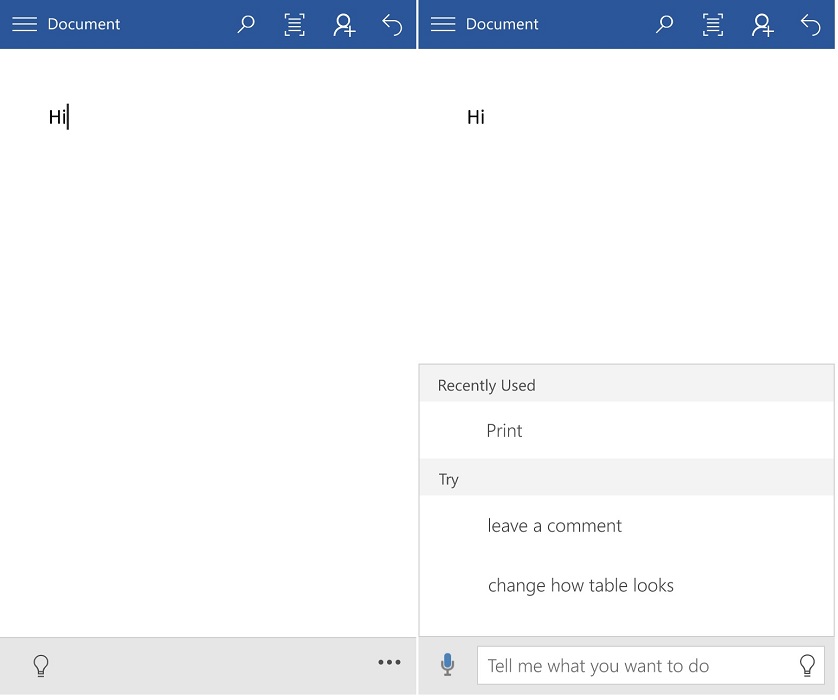 Windows 10 Mobile Word Preview has seen an update today and the version has jumped to 17.6027.10062. The most visible change / feature the update brings can be seen in the bottom left corner in above screenshots. You have a small icon that allows you to do certain things like “Print, Leave a comment and more” by just typing in the box or by using your voice.